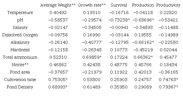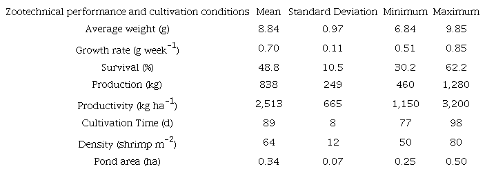 To assess the influence of cultivation time, pond area, pond density and water quality on parameters related to zootechnical performance (average weight, growth rate and survival of shrimps, production, and productivity of ponds), correlation analysis was performed. For this, the Shapiro-Wilk normality test was used. Correlations involving parameters with non-normal distribution were performed using the Spearman’s coefficient, while those involving parameters with normal distribution were performed using Pearson's coefficient. Analyzes were performed using the PAST version 3.17 software (Hammer, Harper, & Ryan, 2001).