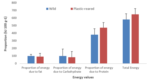 Generally, the total energy (TE) as contributed by the proportion of total energy due to protein (PEP), proportion of total energy due to carbohydrate (PEC) and proportion of total energy due to fat (PEF) in the tissues of both wild and plastic-reared C. armatum are similar (Figure 1). In addition, non-significant differences (p > 0.05) were observed between wild and plastic-reared crabs. However, wild crab was slightly higher in PEF (99.04 kJ 100 g-1) and PEC (100.07 kJ 100 g-1), but lower in PEP (381.59 kJ 100 g-1) and TE (580.70 kJ 100 g-1) compared to plastic-reared crab. The higher PEP (472.71 kJ 100 g-1) in plastic-reared C. armatum indicates that protein concentration in terms of energy would be more than enough to prevent protein energy malnutrition in children and adults fed solely on the plastic-reared crabs as main source of dietary protein. The energy values found in this present study are comparable to the range of 309.11- 344.94 kJ 100 g-1 for imported shellfish species (Lawal-Are, Moruf, Ojeah, Taiwo, & Aligbeh, 2021).