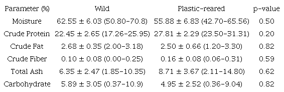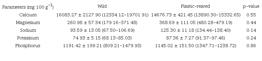 Mineral content in both wild and plastic-reared C. armatum is shown in Table 2. In wild crab, contents of calcium (16083.27 ± 2127.90 mg 100 g-1) and phosphorus (1191.42 ± 199.21) were relatively higher, while contents of magnesium (368.69 ± 111.05 mg 100 g-1), sodium (125.30 ± 11.18 mg 100 g-1) and potassium (87.36 ± 7.27 mg 100g-1) were relatively higher in plastic-reared crab. The difference in mineral content of plastic-reared crab and its counterpart from the wild was not significantly different (p > 0.05). The results agree well with the report of Oluwole et al. (2020) on the mineral profile of C. armatum fattened with trash fish and formulated diet.