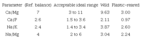Table 3 shows some significant mineral ratios in wild and plastic-reared C. amartum. Ideally, Ca/Mg should be a 7:1 ratio of calcium relative to magnesium. In other words, there should be found 7 times more calcium relative to magnesium found in the diet. However, the ideal or preferred range can vary from 3.0 to 11.0. The sample results gave respective ratios of 9.63 and 3.00 for wild and plastic-reared crabs, which are within the ideal range. This means that both wild and plastic-reared C. amartum can stand as the only source of calcium in a diet. Calcium and magnesium appear to have a synergistic relationship in the body. Each can affect both the absorption and excretion of the other. According to Nadler et al. (2018), magnesium deficiency alters the cellular calcium levels in animal system. Also, the negative calcium balance in the body can be reversed by consuming more magnesium (Kelly, Gilman, & Ilich, 2018).