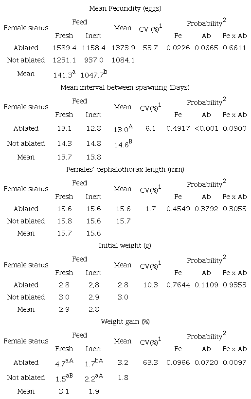 In relation to the weight gain, analyzing each factor separately, it was observed that ablated females receiving fresh feed had higher weight gain in comparison to the other combinations. The statistical tests indicated a positive correlation between fecundity and the total length (r=0.6351, p < 0.0001). The fecundity did not show correlation with the cephalothorax length (r=0.1045, p=0.1233) and weight gain (r=0.0907, p=1526).