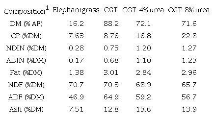 Elephantgrass was chopped in a stationary forage chopper to particles of 2 to 3 cm. The chopped forage was ensiled according to the following treatments: elephantgrass only (EG), and elephantgrass with the inclusion of 5% (CGT5) or 10% (CGT10) of CGT untreated or ammoniated with 4% (CGT5U4, CGT10U4) or 8% (CGT5U8, CGT10U8) of urea (DM basis). Before ensiling, three 250-g samples of the ingredients were dried in a forced-air oven at 60ºC for 72 h, ground in a Wiley mill with a 1-mm sieve, and finally analyzed for the chemical composition according to the methodologies described by Detmann et al. (2012) (Table 1).