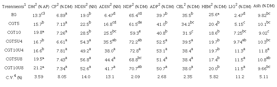 The DMR was greater (p < 0.05) in the EG silage than in the silages that contained CGT (Table 3). Thus, regardless of whether it was ammoniated or untreated, CGT was not as efficient for increasing DMR as other agricultural byproducts and wastes (i.e., cassava peel, coffee husks, cacao bran, and cottonseed cake, Andrade et al., 2010; Viana et al., 2013).