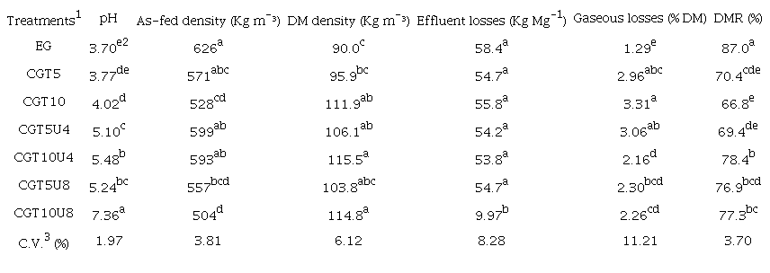 The silage as-fed (AF) and DM densities changed (p < 0.05) with the addition of CGT in different ways. The AF density of the EG silage (626 kg m-³) differed (p < 0.05) by more than 100 kg m-3 in relation to CGT10U8 (504 kg m-³) (Table 3). However, DM density increased (p < 0.05) with the inclusion of 10% CGT, either untreated or ammoniated, in comparison with EG.
