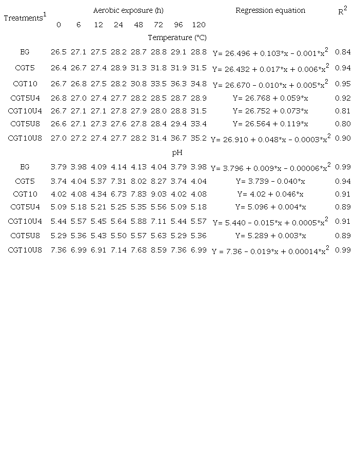 All treatments increased pH as a function of post-opening time (Table 4). After silo opening, the pH rises when organic acids that preserve the silage are consumed by microorganisms (Wilkinson & Davies, 2012; Wilkinson & Rinne, 2018). The EG, CGT10U4 and CGT10U8 silages showed a quadratic increase in pH (R2> 0.91), whereas in the other treatments the pH rose linearly (R2 > 0.89).