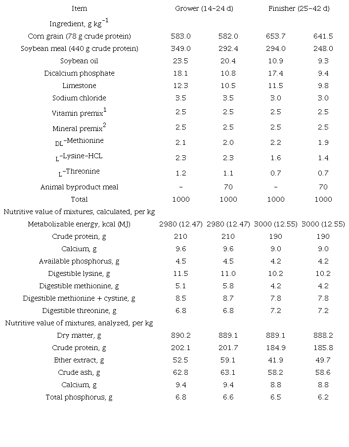 Grower (14 to 24 d), and finisher (25 to 42 d) diets were formulated to meet or exceed the nutrient requirements according to Ross 308 guidelines (Aviagen, 2014; Table 1). All experimental diets were produced in pelleted form and they all are iso nutritive. The ingredient composition and nutrient content of the experimental diets are shown in Table 1.
