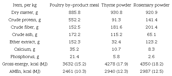 Poultry by-product meal, thyme and rosemary powders were ground through a 1-mm screen and then stored for further analysis. The nutritional composition of PBPM, thyme and rosemary powders are shown in Table 2. Nutritional compositions of PBPM, thyme and rosemary powders were determined for dry matter, ether extract, total ash, crude protein (Kjeldahl N × 6.25), crude fiber, calcium and total phosphorus (Association of Official Agricultural Chemists [AOAC], 2005). The gross energy contents of the PBPM, thyme, and rosemary were measured using an adiabatic bomb calorimeter (model C 4000; IKA, Heitersheim, Germany). Nitrogen-corrected apparent metabolizable energy (AMEn) estimated from the chemical composition (WPSA, 1984). All analyses were performed in triplicate.