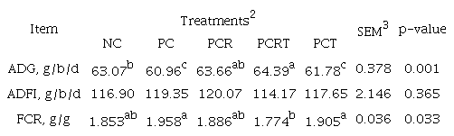 Bodyweight and feed consumption by pen were recorded weekly to calculate average daily gain (ADG), average daily feed intake (ADFI), and feed conversion ratio (FCR; feed/gain). Mortality was recorded daily.