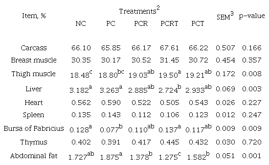 At the end of the experiment, two chicks from each pen (8 birds per treatment) were randomly selected and then slaughtered by cervical dislocation for carcass evaluation. Each individual organ was weighed, recorded, and were presented as percentage of live body weight; breast and thigh muscles, liver, heart, spleen, thymus, bursa of Fabricius and abdominal fat (Kakhki, Bakhshalinejad, & Shafiee, 2016).