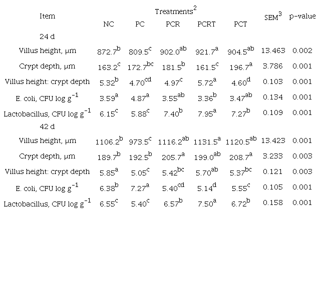Ileal villus height and villus height to crypt depth ratio were lower (p <0.05) in the PC group compared to NC group at d 21 and 42 (Table 5). Birds of PCRT had higher (p <0.05) ileal villus height than PC birds on d 21 and 42. Furthermore, birds of PCT at d 21, and PCR and PCT at 42 d of age had higher (p <0.05) ileal crypt depth than PC birds.