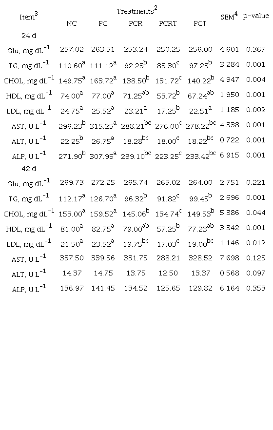 After 8h feed withdrawal at 24 and 42 d of age, two birds per pen were randomly selected, and then their blood samples were taken from the brachial vein. The blood samples were spin at 2,000 × g for 5 min. at 4°C and frozen at -20°C for future analysis. Concentrations of serum glucose (Glu), triglycerides (TG), cholesterol (CHOL), high-density lipoprotein (HDL), low-density lipoprotein (LDL), alanine aminotransferase (ALT), aspartate aminotransferase (AST), and alkaline phosphatase (ALP) were assessed using an automatic biochemical analyzer (Hitachi 717, Boehringer Mannheim, Ingelheim am Rhein, Germany) with commercial assay kits according to the manufacturer’s instructions (Pars Azmoon Co. kits, Tehran, Iran). The blood samples were analyzed by a spectrophotometer (UV-2100, Unico Instruments Co., Shanghai, China) to measure superoxide dismutase (SOD), glutathione peroxidase (GSH-Px) and catalase (CAT) activities and concentration of malondialdehyde (MDA) as described by Bakhshalinejad et al. (2018).