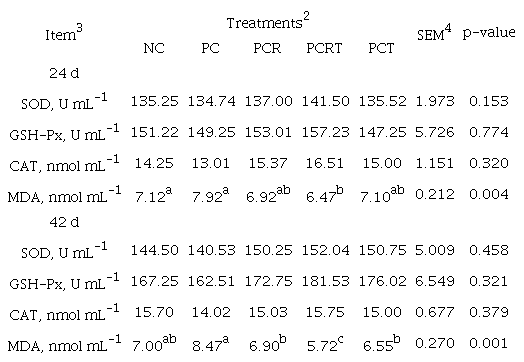 The effects of the experimental treatments on the activities of superoxide dismutase, glutathione peroxidase, catalase, and concentration of malondialdehyde in the blood serum of broiler chickens on d 24 and 42 d are presented in Table 7. The activities of superoxide dismutase, glutathione peroxidase and catalase in the blood serum were not affected on d 24 and 42 (p >0.05). The serum concentration of malondialdehyde decreased (p <0.05) in PCRT birds compared to the PC group at 21 and 42 d of age.