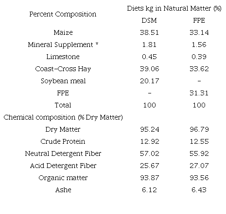 The treatments were constituted according to the protein sources in the feed: in the first diet, defatted soybean meal (DSM) and in the second, forage palm meal with protein enrichment (FPE), through the biotechnological process of the company Tortuga. The diets were formulated according to the National Research Council [NRC] (2007), to meet nutritional requirements and provide weight gain of 150 g day-1, with 2.6 Mcal of energy kg-1 and 12.5% crude protein (Table 1).