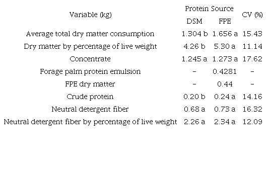 For the variables concentrate consumption (CC), consumption of neutral detergent fiber per kg animal-1 day-1 (NDFC) and percentage of live weight (NDFCLW), no significant differences were observed between diets (p >0.05), however, a higher consumption of crude protein (CPC) was observed in the diet with FPE (p <0.05) in relation to the consumption of the traditional diet.