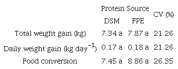 For the variables total weight gain, daily weight gain and feed conversion, no significant differences were observed (Table 3), but the daily weight gains obtained were higher than those recommended by the NRC (2007), of 0.15 kg day-1, demonstrating that the feed provided enough nutrients to meet the needs of the animals.