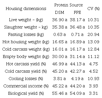There were no significant differences (p >0.05) between diets for any of the carcass measurements (Table 4). The cold carcass weight, variable used at the time of animals sale, were within the standard recommended for the species (greater than 13.8 kg), varying according to the slaughter and feed weight, presenting values similar to those obtained by Grandis et al. (2016) and Ferreira et al. (2016), mainly due to the similar weight of the animals and the high digestibility of the foods used in these studies.