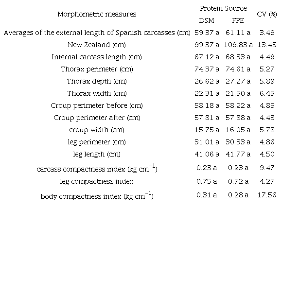 For internal carcass length, the same authors observed values lower than those obtained in the present study, possibly due to the difference in the feed used. The thoracic perimeter and croup variables were similar between diets, which may vary according to age, weight and breeds used, with lower values for young and less heavy animals, as well as the type of feed provided (Silva et al., 2016b). Leg length, chest width and croup width can vary between breeds (Ferreira et al., 2016; Pellegrin et al., 2018), with no significant difference between diets in this study.