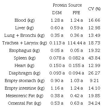 The edible components of the carcass (Table 6) did not vary between diets, however, they may vary depending on the breed (Pellegrin et al., 2018), type of dietary ingredient (Ferreira et al., 2016), and weight of the animals (Silva et al., 2016b).