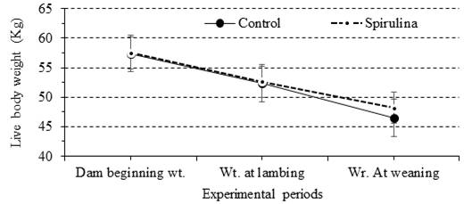 Post lambing, the treatment group ewes were superior in live body weigh since they recorded the highest values at 15, 30 and 45 days as well as at 60 days post-lambing (at weaning). The records of the two experimental groups showed that adding Spirulina to the diets of Rahmani ewes seemed to have no effect (p =0.28) on the average live body weight change (being 9.3 ± 0.76 Vs. 10.9 ± 1.39 kg) for the whole experimental period (Figure 1). Although there was no significant increase in average dry matter intake in both groups, the addition of SP to the treated animals kept their weight loss less than that of the control ones. This may be due to the high values of SP from CP and ME (Table 2), which may be reflected on the nutritional value of the diets. Such preserve effect of daily supply from minerals and vitamins via adding SP to ewe's diets is supported by Jameson (2020) suggestion that such supplying sources ensuring the maintenance of body functions with limited available body reserves during late pregnancy.