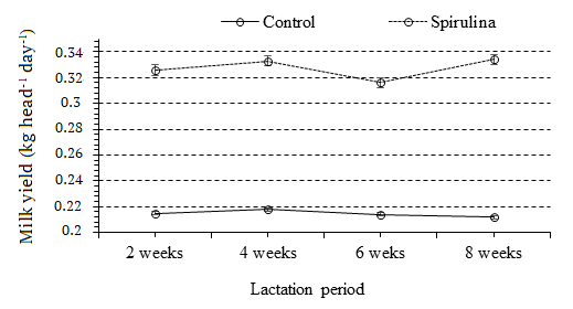 Yaakob, Ali, Zainal, Mohamad and Takriff (2014) reported that Spirulina has been commonly used in food supplements due to its exceptional nutrient compositions and digestibility, also showed that the Spirulina has shown considerable effectiveness and increased milk production. Khalifa et al. (2016) found that the overall means of milk production throughout seven weeks of lactation was statistically significant (p <0.05) higher in the group fed Spirulina during the first three weeks of lactation. While, advancing of lactation curve another four weeks Zaraibi does in the Spirulina group was appeared non-significantly booster in milk harvest than does in the control group.