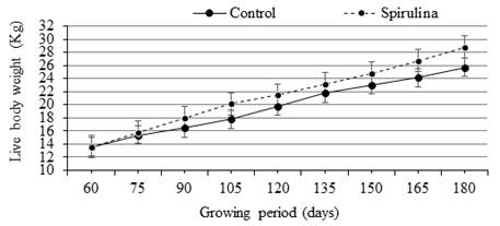 Figure 3 illustrated that lambs fed algal extract additive in their diets improved significantly (p <0.01) their average live body weight. The lambs started with a similar average live body weight of 13.6 ± 0.7 kg for both experimental groups. The significant difference between the two tested groups started to appear at 90 days of age and continued in increasing tell the end of the trial (at 180 days of age). It seems that the Spirulina addition to the second group enriched the energy content that used efficiently in the growing of the treated group compared to those in the control group. The results of better growth performance in lambs fed SP supplemented diets obtained herein can be explained by the subsequence of high nutrient density of SP which may stimulate the secretion of gut microflora for extracellular enzymes as suggested by Tovar-Ramírez et al. (2002). Due to the rich structure of Spirulina from several nutrients, especially vitamins, minerals, essential fatty acids, amino acids and other nutrients it was suggested to may induce faster growth (Gershwin & Belay, 2008).