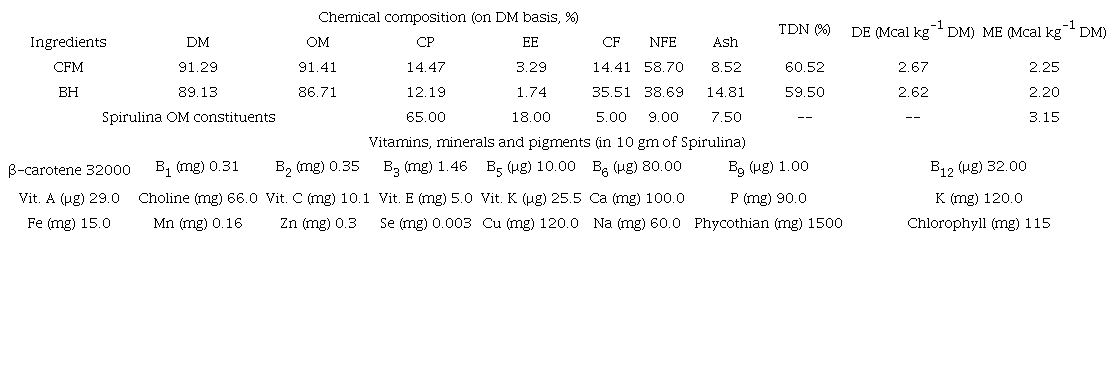 The nutrients requirement was calculated according to NRC (National Research Council [NRC], 2007). Animals were fed the assigned ingredients of CFM which consists of 25% un-decorticated cotton seed meal, 43% yellow corn, 25% wheat bran, 3.5% molasses, 2.0% limestone, 1.0% common salt and 0.5% vitamin and minerals mixture (Contains per 3 kg: 1000000 IU Vit. A; 200000 IU Vit. D3; 10000 mg Vit. E; 1000 mg Vit B1; 5000 mg Vit. B2; 1500 mg Vit. B6; 10 mg Vit. B12; 50 mg Biotin; 250000 mg Colin chloride; 10000 mg Pentothenic; 30000 mg Niacin; 1000 mg Folic acid; 60000 mg Manganese; 50000 mg Zink; 3000 mg Iron; 4000 mg Copper; 300 mg Iodine; 100 mg Selenium and 100 mg Cobalt). Drinking water was available at all over the day times. Diets were offered twice daily at 8.00 am and 3.00 pm.