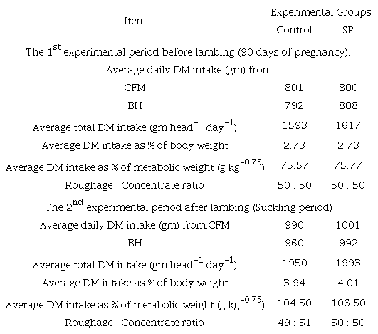 During the late pregnancy and suckling periods, average daily dry matter intake was recorded and calculated relative to live body weight as well as to metabolizable body weight (W0.75). Live weight of the experimental ewes was recorded at 120, 135 and 150 days of pregnancy as well as their weight at lambing. The live body weight of ewes was measured every 15 days post-lambing tell 60 days post-lambing (weaning date) to study the changes in ewes' live body weight. After lambs weaning, at 60 days post-lambing, ewes were hand milked twice daily and daily total milk production were recorded along 8 weeks.