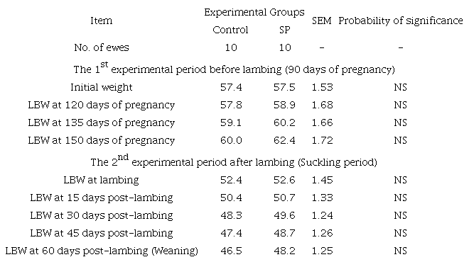 Data in Table 3 indicated that average initial weight (at 90 days of pregnancy) was 57.4 and 57.5 kg for both experimental groups (the control and Spirulina), respectively. Ewes weight gradually increased without significant differences in both groups at 120, 135 and 150 days of pregnancy compared to their initial weight. At lambing, the control group recorded 52.4 Vs. 60.0 kg at 150 days of pregnancy, while the treatment group recorded 52.6 Vs. 62.4 kg for the same period.