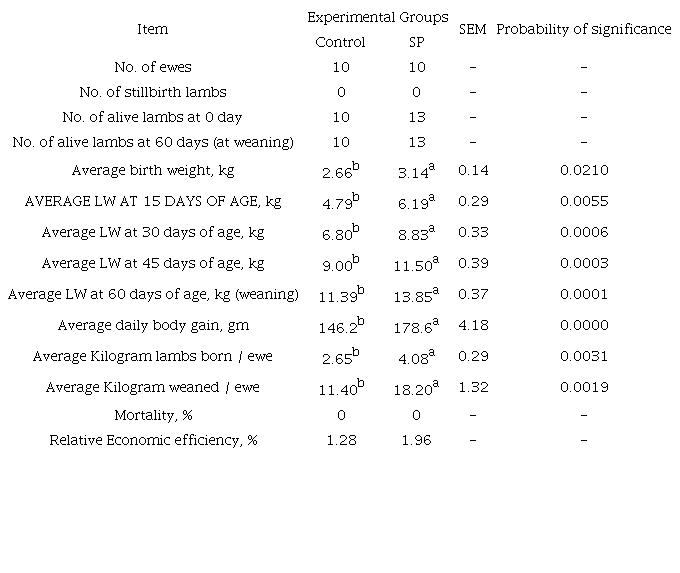 A perusal of data in Table 4 indicated that both groups maintained its born lambs (10 for the control and 13 for the treated group) alive at 0 days and at 60 days (weaning) and there were no stillbirth lambs.