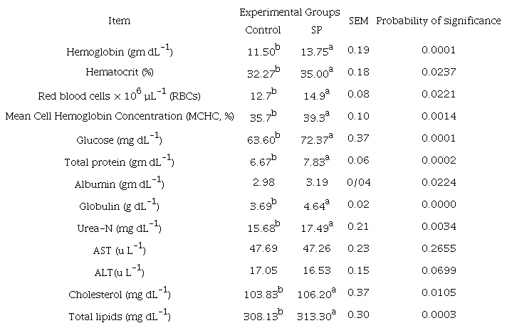 Table 5 explored the results of blood and serum tests as some health indicators. From the obtained figures, it is clear that hemoglobin, hematocrit %, RBCs count as well as MCHC% were significantly (p <0.01) higher in the treated group than those of the control. Moreover, serum tests recorded also significantly (p <0.01) higher values of glucose, total protein, globulin, Urea-N, cholesterol and total lipids in the treated group than those in the control ones. While, albumin as well as liver enzymes (AST and ALT) were not significantly differed between the two experimental groups. The positive results in some blood hematological parameters obtained herein can be attributed to the rich content of SP from crude protein, vitamin B12, Fe as well as other essential macro- and micro-elements.