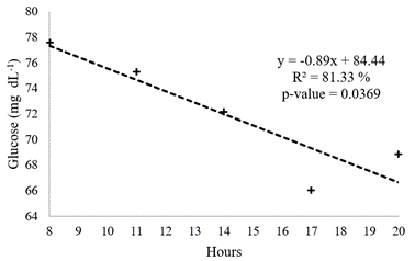 For the collection times, blood glucose decreased linearly throughout the day (p < 0.05) (Figure 1). This is because, when food is offered, there is a stimulus for having meals (Schultz et al., 2019), thus increasing intake, leading to glucose peaks.