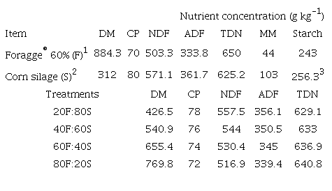 The treatments consisted of inclusion levels of extruded forage, being tested the product Foragge® 60% (F) replacing corn silage (S). The treatments were: 20% Foragge® and 80% Corn Silage (20%F:80%S); 40% Foragge® and 60% Corn Silage (40%F:60%S); 60% Foragge® and 40% Corn Silage (60%F:40%S) and 80% Foragge® and 20% Corn Silage (80%F:20%S). The diet was provided twice a day, at 08:00 and 16:00h, and animals had free access to water and mineral salt specific for sheep. Foragge® 60% is an extruded product made up of 60% Urochloa brizantha grass, starch, vitamin mineral premix and sunflower meal. The chemical composition of Foragge® 60%, silage and treatments are listed in Table 1.