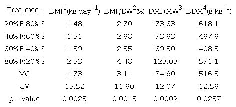 There was a significant difference for dry matter intake (DMI) in kg day⁻¹, as a function of body weight (%) and as a function of metabolic weight, showing a quadratic behavior (p < 0.05). The maximum point for intake was for ewes fed 80% extruded forage and 20% corn silage (Table 2). The minimum point was for 45.33% Forrage® with dry matter intake of 1.12 kg per day. Changes in intake occurred due to forage processing by extrusion providing different particle size and density compared to corn silage, leading to changes in rumen content.