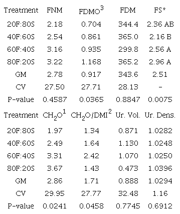 With regard to urine volume and density, there was no significant difference between treatments (p > 0.05) (Table 3), which shows that the increase in water intake was to compensate for the lack of water in the extruded forage. The mean value of urine volume was within the recommended range according to Reece (2006), from 100 to 400 mL for every 10 kg body weight for sheep. Likewise, the mean value for urinary density was in agreement with Hendrix (2005), between 1,010 and 1,040 for sheep, demonstrating that sheep had adequate hydration and did not present kidney disorders.
