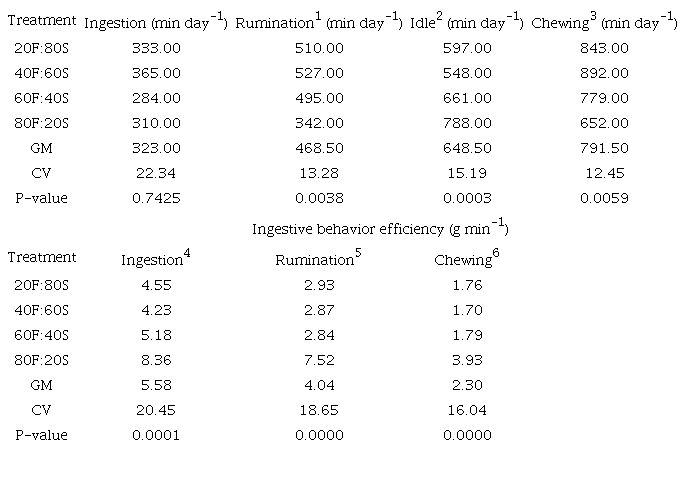 Activity calculations were made in minutes per day, assuming that, in the five minutes following each observation, the animal remained in the same activity. The total time spent chewing was determined by adding the times spent in ingestion and rumination. The efficiency of ingestion, chewing and rumination were obtained according to Polli, Restle, Senna and Almeida (1996).