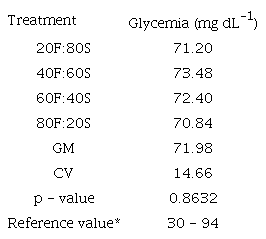 For glycemic assessment, the first collection was performed on day 6 of measurements, at 8 am (before the first meal), 11 am, 2 pm, 5 pm and 8 pm. On the day of glycemic assessment, the second meal was only offered after the 20:00 collection. Samples were collected by jugular venipuncture with the aid of 5 mL Vacutainer® tubes containing fluoride and EDTA, properly identified for each animal. The collected blood samples (glycemia and biochemistry) were centrifuged at 3,000 rotations per minute for 10 minutes, and sera were separated into aliquots, poured into micro tubes and stored in a freezer at -5ºC for later laboratory analysis. All samples were processed in a Bioplus 2000 automated biochemical analyzer (Bioplus©, Barueri-SP, Brazil), using a commercial kit from Lab Test (Labtest Diagnóstica S.A., Lagoa Santa-MG, Brazil).
