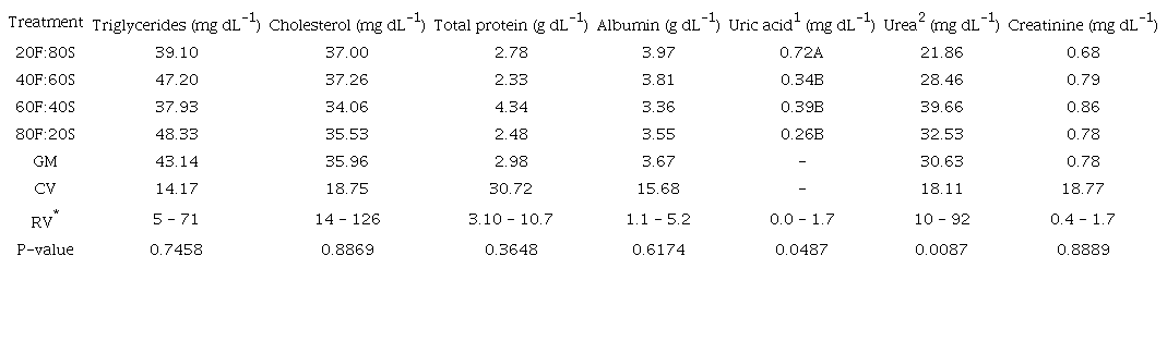 Blood collections to evaluate the biochemical components were made on the first, third and fifth day of the measurement period, always before the first meal, with the fasting animal. To evaluate biochemical components, blood samples were drawn by jugular venipuncture into Vacutainer® tubes without anticoagulant. Biochemical components for determining energy metabolism were: triglycerides and cholesterol; and to determine protein metabolism: total protein (TP), urea, albumin, uric acid and creatinine.