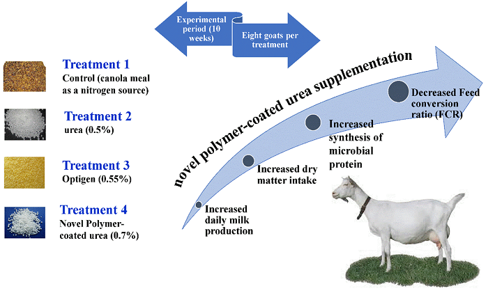 Thirty-two lactating Saanen goats were used in a 10-wk lactation trial, confinement each goat in individual metabolism cage. As it is shown in Figure 1, goats were randomly assigned to each of four different nitrogen (N) source diets (8 goats per treatment) and each animal was fed individually on a daily basis. Treatments were: 1) control (canola meal as a N source); 2) Urea (0.5% urea); 3) Optigen (Alltech. Inc., Lexington, KY) (0.55% Optigen) and 4) Polymer-coated urea (0.7% PCU) (international patent number: A01K5/00, inventor: Mitra Mazinani).
