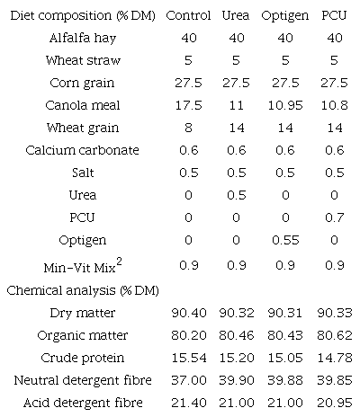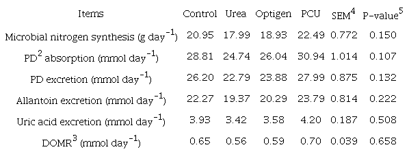 The role of supplementing ruminant diets with non-protein nitrogen is supplying ammonia for ruminal bacteria as a nitrogen source for synthesizing amino acids. Although, high releasing of ammonia can exceed the nitrogen utilization capacity of bacteria and reduce productive performance (Calomeni et al., 2015). It has been reported, oils can defaunation the rumen (Puniya, Singh, & Kamra, 2015), so maybe due to this fact, existence of paraffin (oil) as a coated material in the polymer-coated urea which increased microbial protein synthesis by eliminating protozoa. The synthesis of microbial nitrogen for ‘coated urea’ was greater than other treatments and this difference was also observed in other parameters of microbial nitrogen synthesis. Optigen and control treatments had the greater microbial synthesis, respectively, which indicates using non-protein nitrogen may increase the synthesis of microbial protein, although this difference was not significant. The purpose of any nutritional strategy that is designed to improve microbial protein synthesis is accomplished by improving the final production of the animals or increase efficiency of animal production. Cherdthong et al. (2011) reported an increase in total milk yield by dairy cows fed urea-calcium.