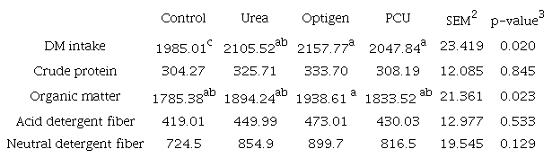 Total diet consumption in polymer-coated urea (PCU) and Optigen were more (p > 0.05) than Control goats. However, consumption of crude protein, NDF and ADF were not affected by treatments (Table 2).