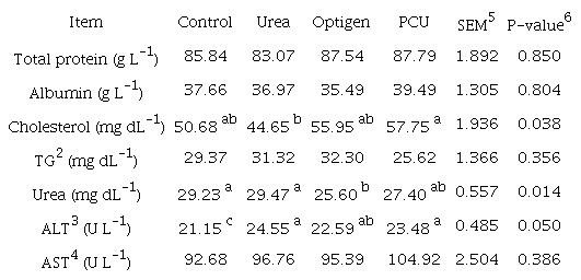 Synthesis of microbial protein was not affected (p > 0.05) by the treatments, however, PCU goats synthesized more microbial protein than other groups, that indicates adding non-protein nitrogen increased synthesis of microbial protein (Table 3). Cholesterol was increased in PCU and Optigen goats than Control. Blood urea concentration was increased in Urea and Control goats. The PCU and Urea treatments increased the plasma ALP concentration (Table 4).