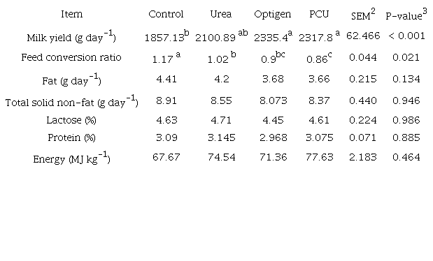 Xin, Schaefer, Liu, Axe and Meng (2010) showed different slow-release urea sources did not affect milk fat. Cameron, Klusmeyer, Lynch, Clark, and Nelson (1991) found milk production was increased by supplementing urea, whereas protein and fat concentrations were not altered. In another study, Supplementing slow-release urea increased milk protein (Tye, Yang, Eun, Young, & Hall, 2017). Dennis, Unruh-Snyder, Neary and Nennich (2012) reported that goats' milk composition was not affected by dietary protein concentration, and this agrees with the present results. Xin et al. (2010) also observed no change in milk protein with a slow-release urea treatment. It can be concluded that feed efficiency was improved with the addition of urea and other non-protein nitrogen sources and increased milk efficiency. According result, coated urea and Optigen had better feed conversion ratio grade compared with control or feed grade urea. In recent study slow-release urea increased milk production but no impact on milk composition. This results was in contract with Santos and Huber (1996) reported that replacing part of soybean meal by Optigen or feed grade urea had no impact on milk yield but agreed with Inostroza, Shaver, Cabrera and Tricárico (2010) reported of increasing milk production when Optigen partially replaced with feed grade urea.
