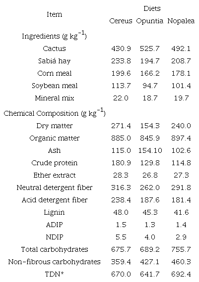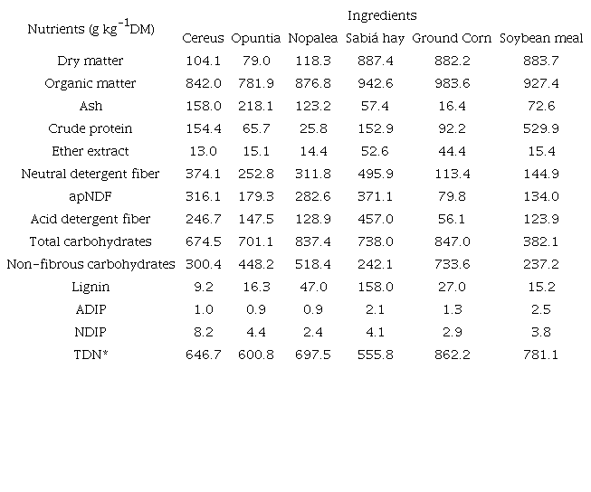 The Cereus cactus, Opuntia, and Nopalea associated with sabiá hay and concentrate have similar nutritional value and can be used in sheep diet.