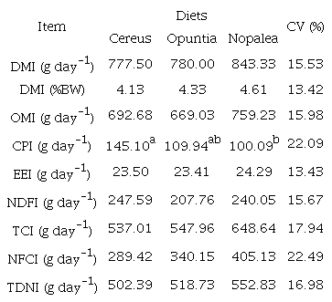 The intake of crude protein (CP) was higher (p < 0.05) for the animals that received the Cereus diet compared to the animals that received the cactus pear diet (Table 3). This result may be explained by the higher CP concentration in the Cereus treatment compared to the others (Table 2).