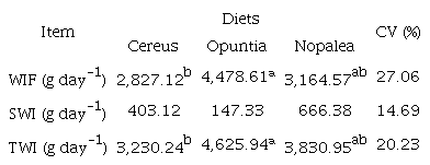 There was a difference (p < 0.05) for water intake via food (WIF) between diets, with the highest water intake via food observed for lambs fed Opuntia diet (4,478.61 g day-1 of water) (Table 4). It occurred because it presented lower DM concentration (Table 2), and the lowest water intake via food was observed by the Cereus diet (2,827.12 g day-1 of water) due to its greater concentration of dry matter in the diet (Table 2).