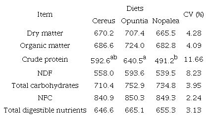 The average OM intake in the diets was 706.98 g day-1. The lack of significance of this parameter is explained by the similar behavior for DM intake. Reinforcing this intake, Costa et al. (2012) reported that digestible organic matter is important in providing energy to ruminal microorganisms which is essential for microbial protein synthesis. Consequently, the absence of effect of diets on the TDN intake, with a mean of 524.65 g day-1, shows the same behavior observed for DM and other nutrients intakes, due to the similarity on the energy value among the cacti.