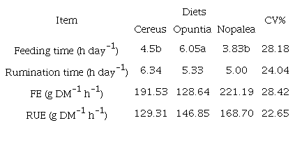 The rumination times, feeding efficiency (FE), and rumination efficiency (RUE) variables were not influenced (p > 0.05) by the cacti used in diets (Table 6). Lopes et al. (2020) also did not observe differences in rumination times and feeding, and rumination efficiencies when comparing the varieties of Nopalea and Opuntia.