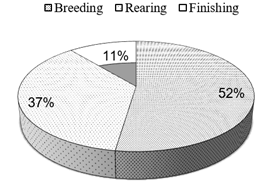 The farm develops the full cycle of beef cattle production and, during the study period, had a herd with 4,335 head of cattle, divided into breeding, rearing and finishing (Figure 2). The herd is split into lots in accordance with the animal category: breeders, heifers suitable for breeding, empty heifers and cows, pregnant heifers and cows, heifers and cows in the maternity pen, calved cows with calves at foot, weaned calves and heifers, smaller calves and heifers, larger calves and heifers, growing calves, fattening oxen.