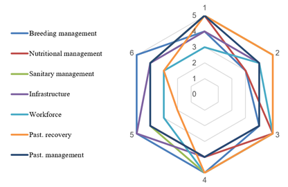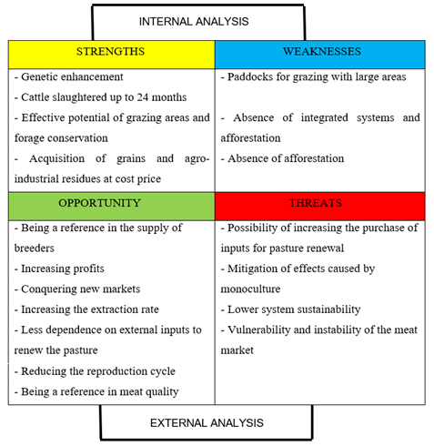 To analyze the internal environment, the activities were classified as strengths and weaknesses, through evaluations in the form of scores between the lowest and highest relative levels, on a scale from 1 to 5. The latter refers to: 1 (very bad), 2 (bad), 3 (average), 4 (good) and 5 (very good). To facilitate the understanding, groups were divided for each evaluation and analyzed by means of the information obtained during the interview. The evaluated groups were: breeding management, sanitary management, nutritional management, infrastructure, workforce, technologies used in pasture formation, conservation and recovery, pasture management, and zootechnical indices. The practices performed in each group were evaluated as subgroups. To identify the strengths and weaknesses, the scoring criteria was used, by which the groups that scored from 1 to 3 points were considered Weaknesses, and those with scores of 4 and 5 points were evaluated as Strengths.