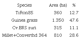 The cultivated pastures consist of grasses of the genus Cynodonspp. (Tifton 85), Panicum maximum (cv. Guinea grass and cv.BRS zuri) and Pennisetum americanum (L) (millet) + Brachiaria (Convert hd 364) (Table 2).